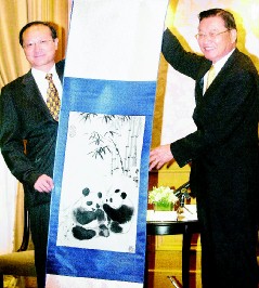 两人礼尚往来,邵琪伟似乎更胜一筹,原来江丙坤准备赠送的伴手礼是莺歌茶具组,外方内圆,象征两岸关系圆融;邵琪伟则当场展开上有一对大熊猫的刺绣品,立即成为吸引全场镁光灯的焦点。